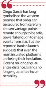 from carefully chosen vantage points—remote enough to be safe, powerful enough to shape events from afar. But the reported Iranian launch suggests that even the most insulated platforms are losing their insulation. Missile diffusion, technological improvisation and widening theatres of conflict are eroding the old geography of sanctuary. Oceans no longer guarantee distance. Islands no longer guarantee invulnerability.