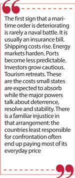 The first sign that a maritime order is deteriorating is rarely a naval battle. It is usually an insurance bill. Shipping costs rise. Energy markets harden. Ports become less predictable. Investors grow cautious. Tourism retreats. Fisheries and coastal livelihoods face disruption from intensified naval activity, possible debris and the wider insecurity that follows strategic escalation. These are the costs small states are expected to absorb while the major powers talk about deterrence, resolve and stability. There is a familiar injustice in that arrangement: the countries least responsible for confrontation often end up paying most of its everyday price.