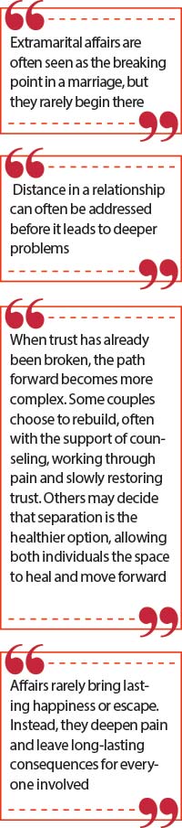 Extramarital affairs are often seen as the breaking point in a marriage, but they rarely begin there. More often, they are the result of emotional distance that has been growing over time. The signs can be easy to miss at first conversations becoming shorter, less meaningful, or purely practical. Time spent together may decrease, replaced by distractions like work, phones, or individual routines. Small conflicts may go unresolved, slowly building resentment, while affection and appreciation begin to fade. Recognising these early signs is important. When partners stop sharing their thoughts, avoid difficult conversations, or feel more like roommates than companions, it may indicate that emotional distance is taking hold. A lack of interest in each other’s daily lives, reduced physical or emotional intimacy, and feeling unheard or unvalued are all signals that should not be ignored. In itself, the world isn’t a kind place, and relationships often face pressures, challenges, and unexpected betrayals that can test even the strongest bonds.