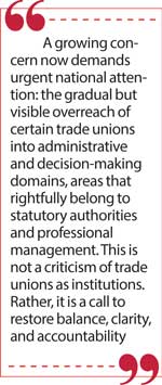 However, a growing concern now demands urgent national attention: the gradual but visible overreach of certain trade unions into administrative and decision-making domains, areas that rightfully belong to statutory authorities and professional management.