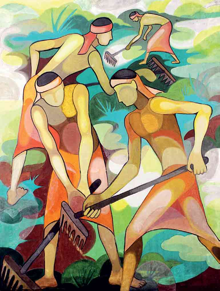 A highlight of the exhibition is Three Figures with a Veena and Still Life, paintings by George Keyt (1901 -1993) who is acknowledged as Sri Lanka’s most renowned and celebrated modern painter. Acquired from a private collection, the works display Keyt’s distinctive style featuring enlarged almond-shaped eyes and bold, crisp lines, often portraying nudes, village scenes, and Hindu-Buddhist mythologies. Keyt became a vital member of the ‘43 Group, contributing significantly to Sri Lanka’s art movement. Keyt leaves behind a legacy of innovative artistic fusion and a profound impact on Sri Lankan artistry.