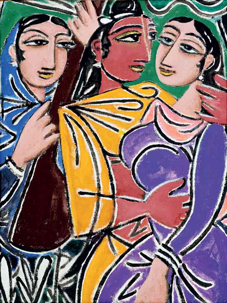 George Keyt, c. 1980, Three Figures with a Veena, Oil on Canvas 91 x 68 cm, Nimal and Malika Cooke Collection