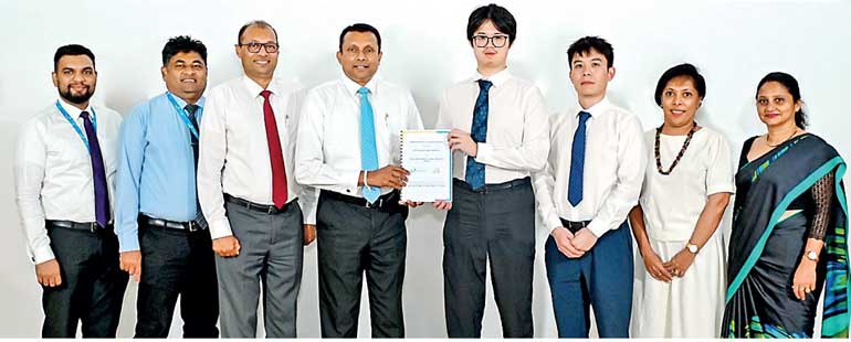 HNB Head of Retail Banking/Senior Vice President Kanchana Karunagama (left) exchanges the agreement with Baili Investments Director Xueyuan Deng, in the presence of senior representatives of the two organisations
