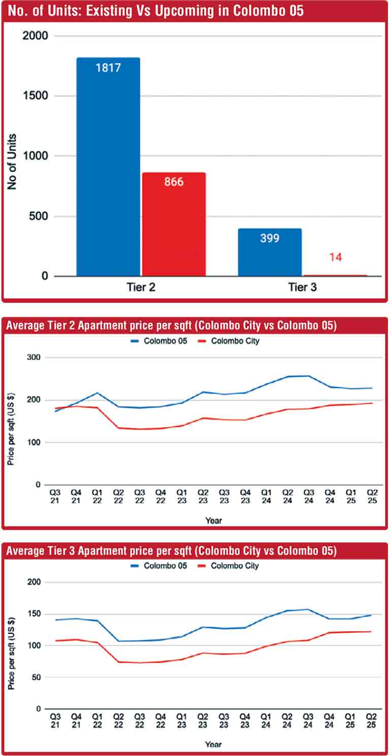With reference to Tier 2 and 3 luxury apartments, Colombo 5 price trends have continued to remain above the average for Colombo as measured on a per-sq.-feet basis. Whilst the entire market dipped in 2022 (in USD terms), the pace of recovery has been strongest in the Colombo 5 area.