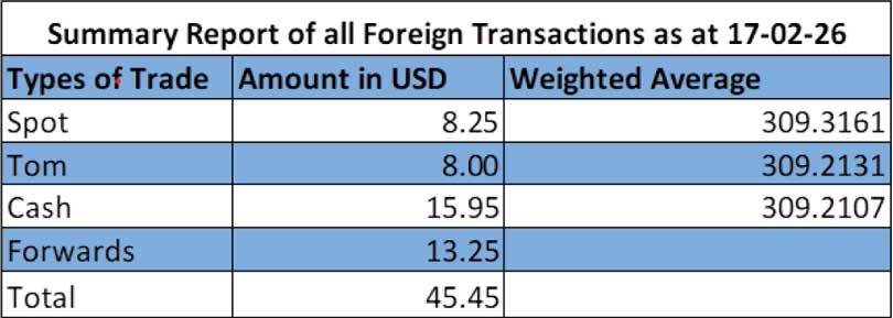 The total USD/LKR traded volume for 17 February was Rs. 45.45 million.