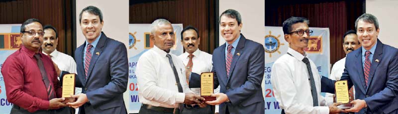 Pioneer Members of the Security Division attached to the MEGAPORT Initiative Retired Assistant Superintendents R.M. Abeykoon Bandara, I.L. Aruna Priyanga and K.M.R.R. Ranasinghe being appreciated by US Embassy Regional Indo Pacific Strategy Coordinator Dustin Bickel