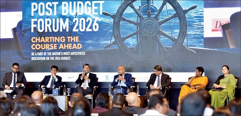 Treasury Secretary Dr. Harshana Suriyapperuma (third from left) speaking at the post-Budget Forum organised by the Daily FT, in partnership with the University of Colombo MBA Alumni Association and sponsored by Standard Chartered Bank at the ITC Ratnadipa, Colombo on Tuesday. Others (from left): University of Colombo MBA Alumni Association President Ajith De Silva, Senior Adviser to the President on Economic Affairs and Finance Duminda Hulangamuwa, Daily FT Chief Editor and CEO Nisthar Cassim (moderator), Standard Chartered Bank Sri Lanka CEO Bingumal Thewarathanthri, Economist Dr. Roshan Perera and Selyn Sri Lanka Business Development Director Selyna Peiris