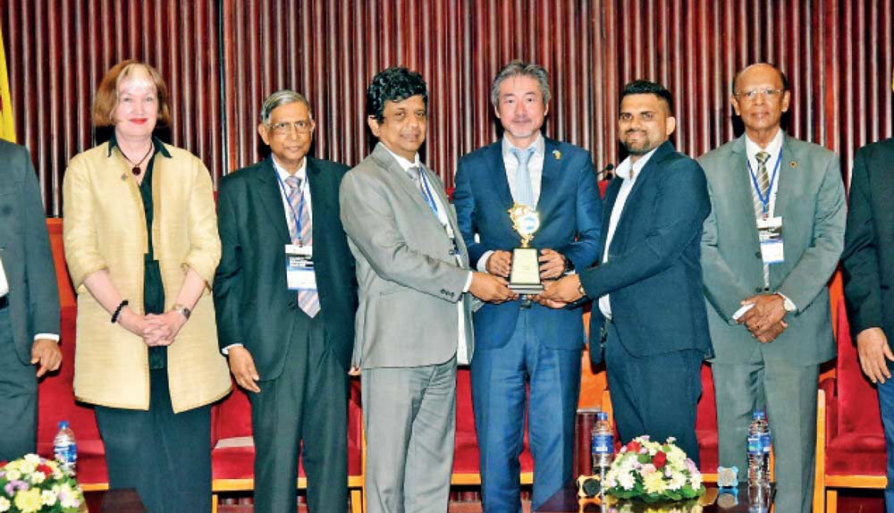 Lindamulage Chaminda Priyankara Silva, Managing Director of Ceilan Coir Products Exports (Pvt) Ltd (third from left) receiving the Overall Gold Award for Best SME Entrepreneur from the Chief Guest Takafumi Kadono, Country Director ADB at the CMA Sri Lanka MSME Business Excellence Awards 2025