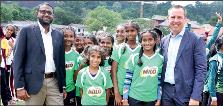 The 32nd Sri Lanka Schools Milo Netball Championship final stage got underway yesterday. Picture shows Nestle Lanka Chairman and Managing Director – Bernie Stefan and Mohamed Ali – Director Dairy and Beverages of Nestle Lanka with young participants at the opening ceremony.
