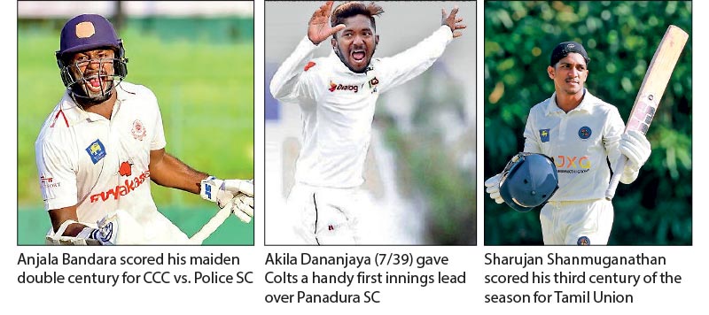 Left-hander Anjala Bandara scored his maiden double century and the second in the current Major Club 3-Day League to put CCC on a firm footing on the second day of their match against Group A table leaders Police SC at the NCC Grounds yesterday.