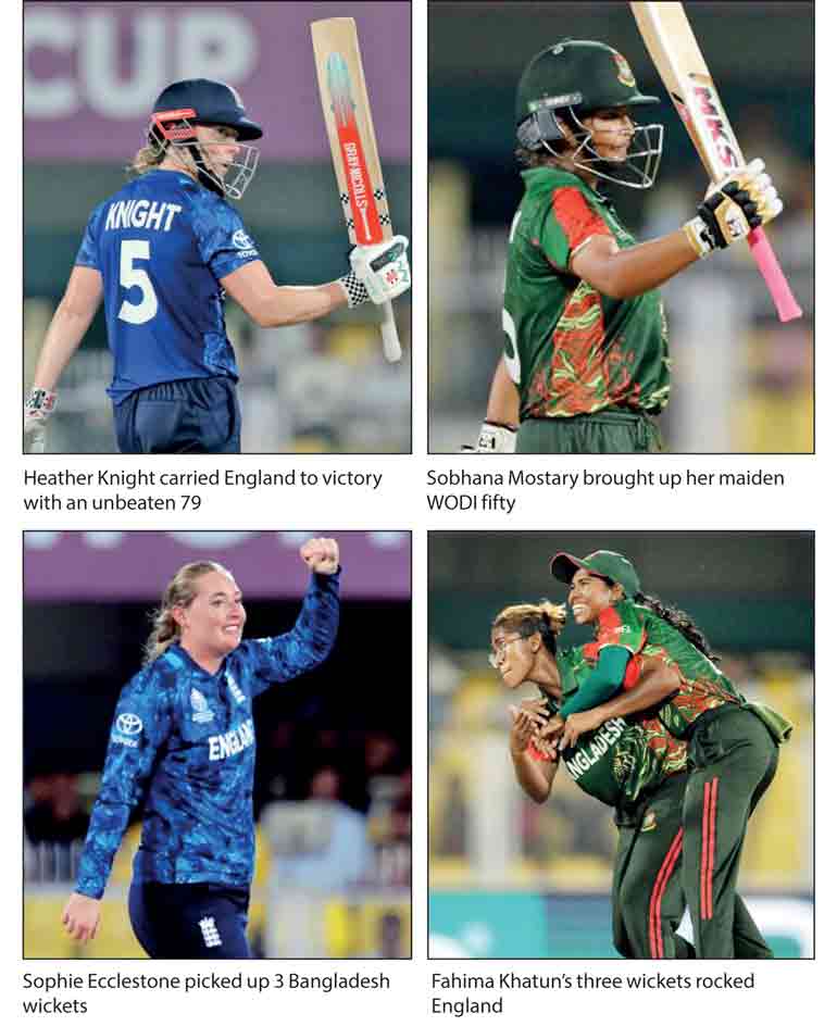 Heather Knight’s composure proved decisive, guiding her side home in a tricky chase. Charlie Dean had mentioned at the break that they needed to dig deep, and that’s exactly what her former skipper did. Marufa Akter once again struck early for Bangladesh, removing both openers, before Nat Sciver-Brunt’s counterattack (32 off 41 balls, 5 fours) ended tamely with a full toss to midwicket. A mini collapse followed with four wickets tumbling for 34 runs, but Knight held firm and, along with Dean, stitched a crucial 80-run stand for the seventh wicket to take England over the line. Player of the Match Knight ended unbeaten on 79 scored off 111 balls (8 fours, 1 six) and Dean was 27* off 56 balls.