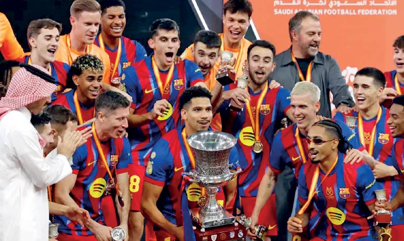Barcelona’s Ronald Araujo lifts the trophy with teammates after winning the Spanish Super Cup final