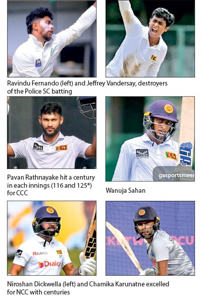 The match, which concluded at the P. Sara Oval yesterday, saw Police SC, chasing a moderate target of 135, crumble to 121 after being firmly placed for an outright win at 73-1. The tables were turned on the Police SC batting by spinners Ravindu Fernando (5/52) and Jeffrey Vandersay (5/33), who helped themselves each to a five-wicket haul.