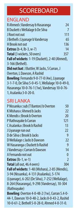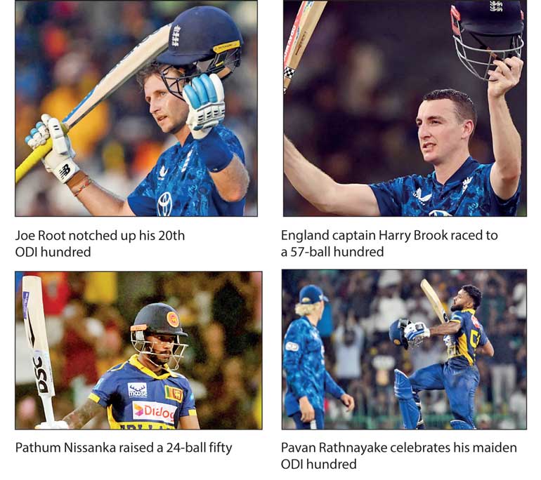 Joe Root and Harry Brook led England’s charge with centuries that saw them rack up their highest ODI total against Sri Lanka - 357-3 surpassing their previous highest of 333-9 in the 1983 World Cup match at Taunton. Sri Lanka were bowled out for 304 after they were given a flying start by their openers Pathum Nissanka (50 off 25 balls, 5 fours, 3 sixes) Kamil Mishara (22) who put on 48 off 31 balls. Although Sri Lanka kept up with the run rate they lost too many wickets with only Pavan Rathnayake carrying on the fight playing a lone hand for 121 off 115 balls (12 fours, 1 six) – his maiden ODI century.