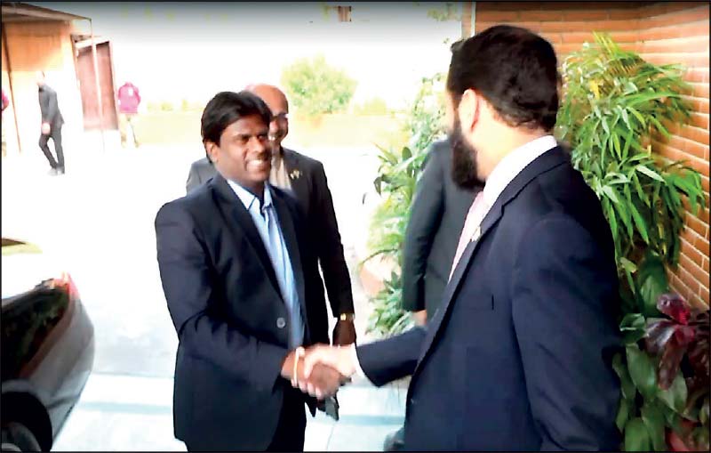 Deputy Youth Affairs and Sports Minister Sugath Thilakaratne (left) shakes hands with Pakistani Information and Broadcasting Federal Minister Attaullah Tarar