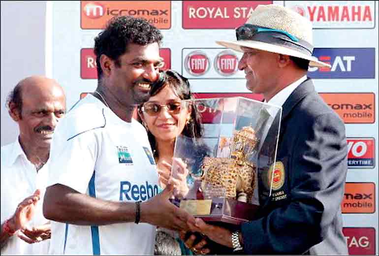 Jayananda Warnaweera (right) presenting Muttiah Muralitharan with a token on