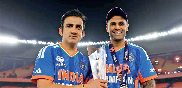 Coach Gautam Gambhir (left) and Captain Suryakumar Yadav with the ICC Men’s T20 Cup which India won on Sunday beating New Zealand