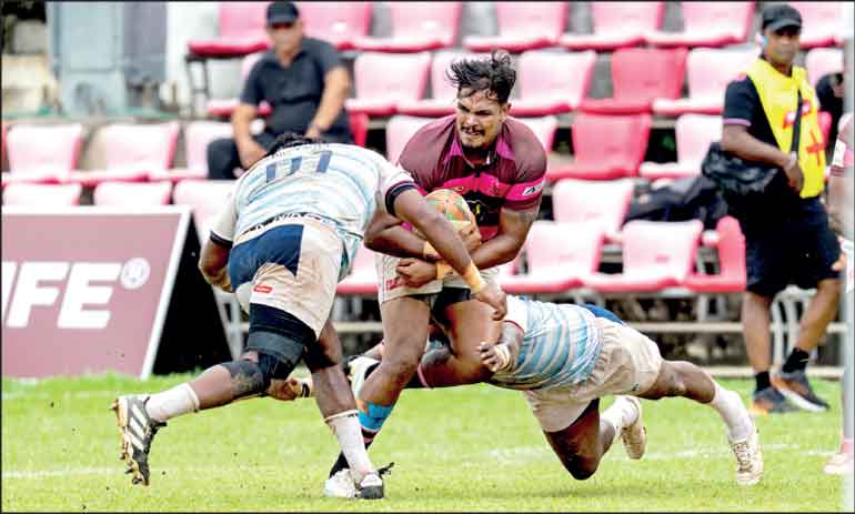 Havies skipper Sandesh Jayawickrema about to be tackled by two