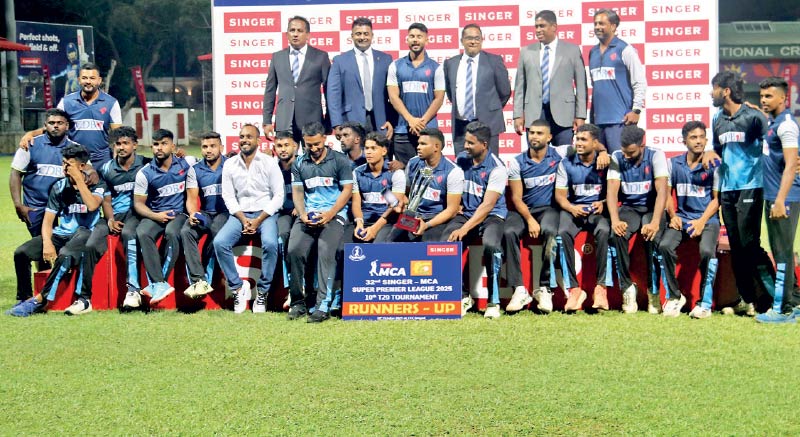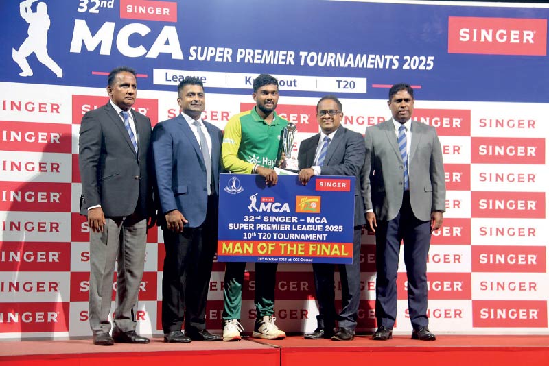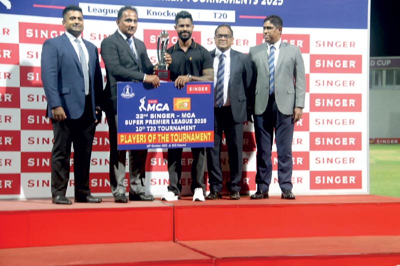 Man of the Final Ramesh Mendis (left) receives his trophy from MCA President Mahesh De Alwis