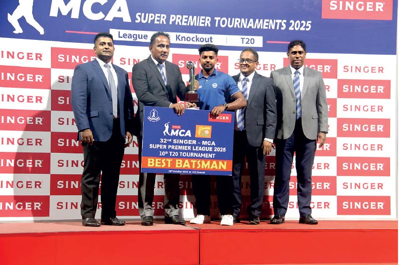 Best Batsman of the Tournament Tharindra Nirmal (right) receives his trophy from MCA Vice President Sirosha Gunatilake