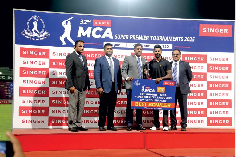 Best Bowler of the Tournament Thanuka Dabare (right) receives his trophy from MCA Tournament Committee Chairman Lakmal de Silva