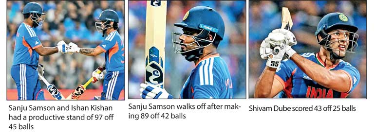 India, invited to bat first, put on a superb batting display. Sanju Samson made the most of Brook dropping him at 15, and put on a display of explosive hitting on a flat Mumbai track to score his second successive fifty – 89 off 42 balls (8 fours, 7 sixes). There was support from Ishan Kishan (39), who helped him add 97 off 45 balls, and cameos from Dube (43 off 25 balls, 1 four, 4 sixes) and Pandya (27 off 12) that enabled India to what seemed like a well-above-par, if not par, total.