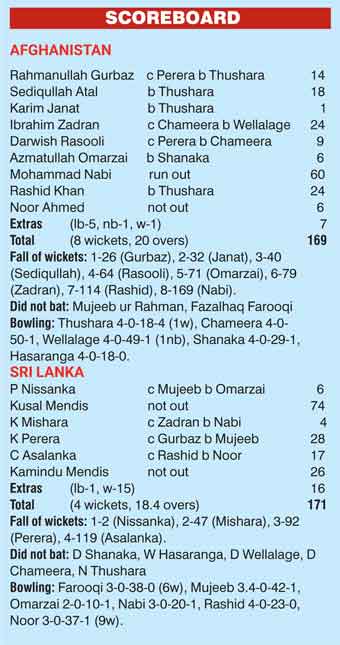 ABU DHABI: Sri Lanka’s wicket-keeper/batsman Kusal Mendis found form just as the Super Four is dawning, guiding his team to a six-wicket win against Afghanistan in the final Group B match of the Asia Cup, played at the Zayed Cricket Stadium here yesterday.In a tricky run chase, the opener top-scored with 74* off 52 balls (10 fours), as Sri Lanka chased down Afghanistan’s total of 169-8 to win with 8 balls to spare. The win for Sri Lanka meant that they topped Group B with three wins and qualified for the Super Four with Bangladesh, who ended up second with two wins. Afghanistan was knocked out of the tournament after yesterday’s defeat.
