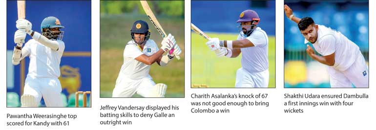 Kandy 209 and 229-9 (Lahiru Udara 41, Sohan de Livera 28, Pawantha Weerasinghe 61, Ashen Bandara 20, Jeffrey Vandersay 23*, Isitha Wijesundara 2/34, Asanka Manoj 3/60, Ramesh Mendis 2/26)