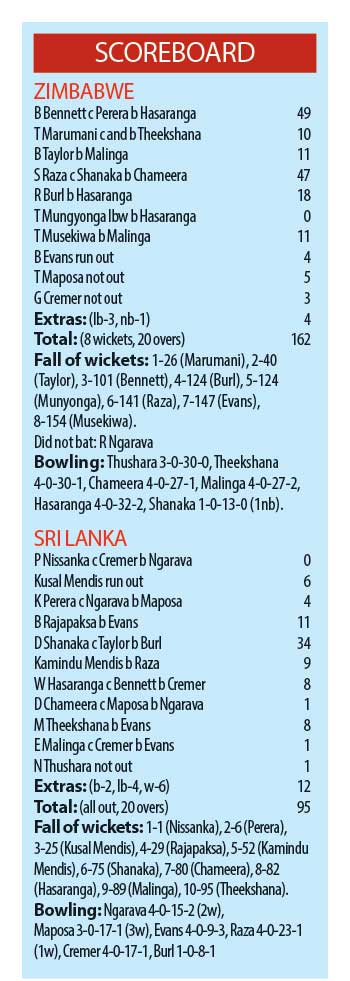 Zimbabwe produced a dominant all-round performance to rout Sri Lanka for 95 and win their second match of the T20I Tri-Series by 67 runs at the Rawalpindi Cricket Stadium yesterday.
