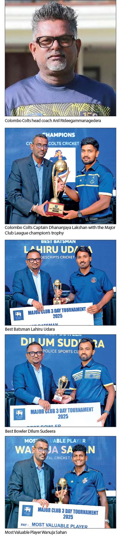Former first-class cricketer with 6,534 runs and 302 wickets Anil Rideegammanagedera’s (a.k.a. Ridee) career as a cricket coach reached a pinnacle with him guiding Colombo Colts CC to win the plum of domestic club cricket – the Major Club 3-Day League – after a gap of 14 years.
