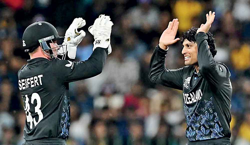 Rachin Ravindra (right) is congratulated by Tim Siefert on his way to a 4-wicket haul