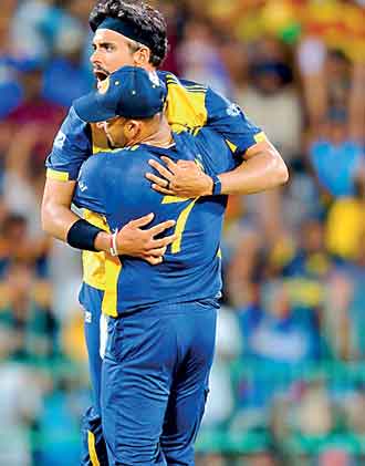 Maheesh Theekshana celebrates a wicket with Dasun Shanaka