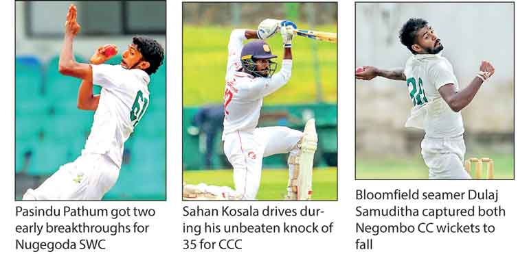At the SSC grounds, CCC put into bat first were not too happily placed at 123-6 against Nugegoda SWC. Seamers Pasindu Pathum got Nugegoda SWC the initial breakthrough with two early wickets in the third over of the innings, then Abdul Hakam kept the pressure on the CCC batting with three wickets. For CCC Dulnith Sigera scored 38, Pavan Rathnayake 26 and Sahan Kosala 35* off 30 balls (7 fours).