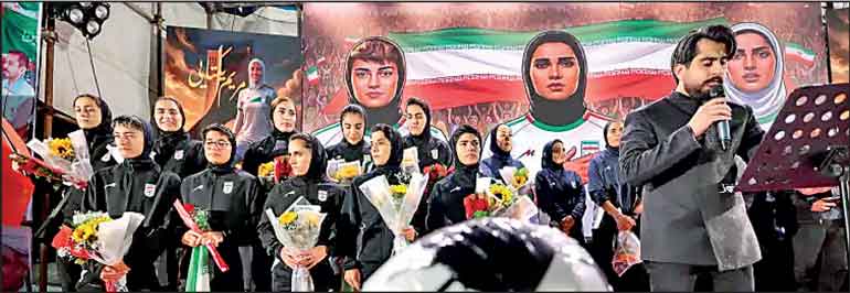 Members of Iran’s women’s national football team in Tehran on 19 March during the felicitation ceremony
