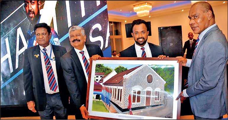 Former Richmond College Principal E.M.S. Ekanayake (right) gifts a memento of a painting to National ODI Captain Charith Asalanka in the presence of Gold Sponsor Channa Wijesekera of Leema Construction