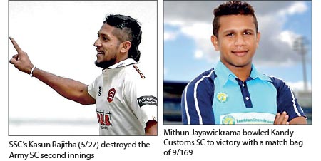 Army SC’s joy of gaining a first innings lead of 48 over SSC was short lived when the table toppers came storming back in the second innings with all guns blazing to pull off a seven-wicket win and thereby register their sixth outright victory out of seven matches in the Tier B 3-Day League game concluded at SLLDC Grounds, Kirimandala yesterday.