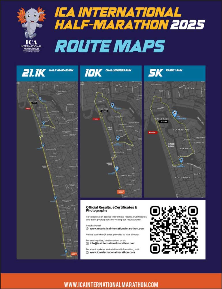 The ICA International Half-Marathon 2025 is made possible through the generous support of leading partners, including Janashakthi Life (Title Sponsor), CARNAGE, CWIT – Adani Ports, Ultratech Cements, Lanka Hospitals (Official Medical Partner), Asia Paints Causeway, Bolt Distribution, Lanka IOC, Dialog Axiata, One Galle Face, Caravan Fresh, Emerging Media (Event Facilitator), Serendib Flour Mills, Air India, Flamingo Duty Free, Pepsi, Physio Tree, Hangla, amongst many others.