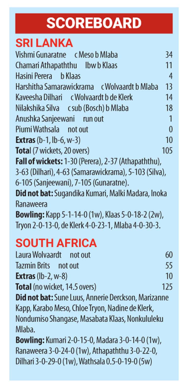 Sri Lanka scored 105-7 off 20 overs, and South Africa powered their way to victory reaching a revised target of 121 through their openers Laura Wolvaardt and Tazmin Brits who put on 125 without loss with 31 balls to spare.