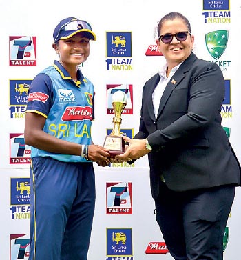 Rashmi Nethranjali (left) receiving the Player of the Match award from Match Referee Vanessa de Silva