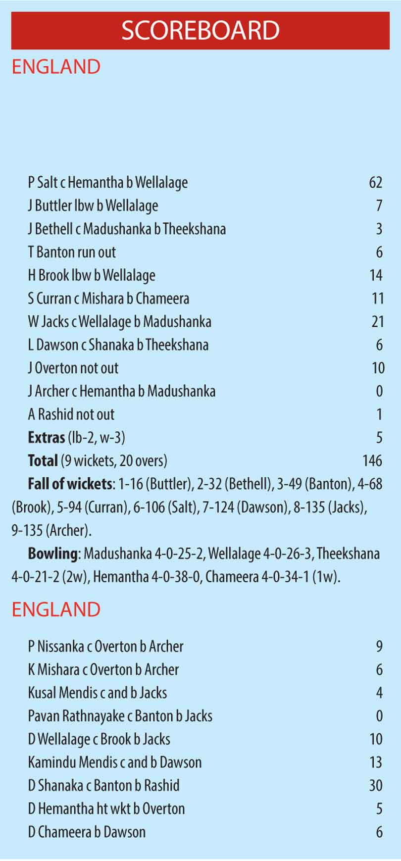 At the halfway stage of the match, Sri Lanka’s camp were cock-a-hoop with their bowlers having done a stupendous job to restrict the powerful England batting line-up to a mere 146 and would have really fancied their chances of chasing down the score. Barring Phil Salt (62 off 40 balls, 6 fours, 2 sixes), none of the batters found the rhythm and timing to build their innings. To add to that, Sri Lanka were superb in the field with their catches and an excellent run out to dismiss Tom Banton in the eighth over played the part in keeping the run-flow in check. 12 overs of spin produced 85 runs and 5 wickets.