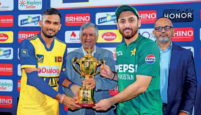 Captains Dasun Shanaka of Sri Lanka and Salman Agha of Pakistan with the Rhino Roofing trophy after the three-match T20I series ended in a one-all draw