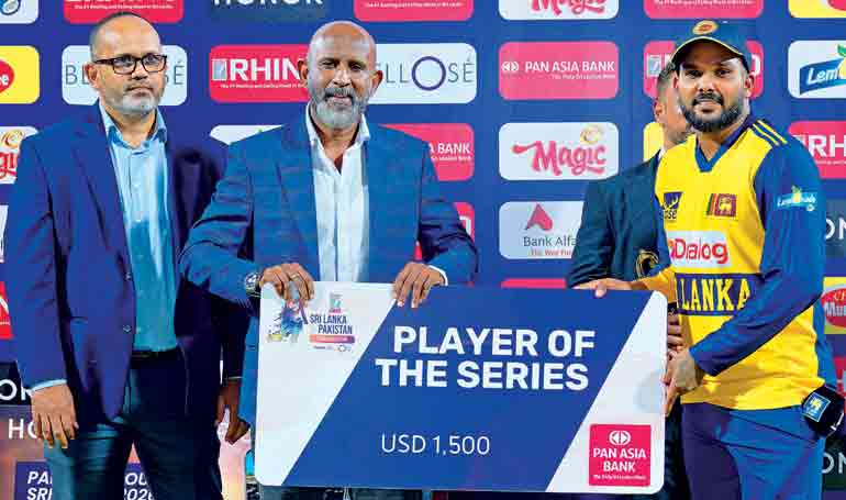 After skipper Dasun Shanaka’s rapid 34 off 9 balls had given Sri Lanka a challenging total of 160, Hasaranga spun a web around the Pakistani batsmen capturing 4/35 to keep them down to a total of 146-8. That performance won him the Player of the Match. He also went on to bag the Player of the Series award as well.