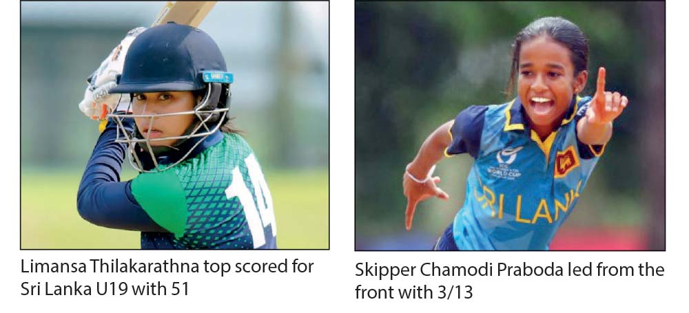 Scores: Sri Lanka Women (U19) 170 (42.4) (Limansa Thilakarathna 51, Shashini Gimhani 39, Extras 29, Trudy Johnson 4/9, Maria Andrews 2/23, Bea Willis 2/40)