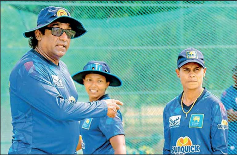 Sri Lanka Women Head Coach Rumesh Ratnayake with players Hasini Perera and Nilakshi Silva