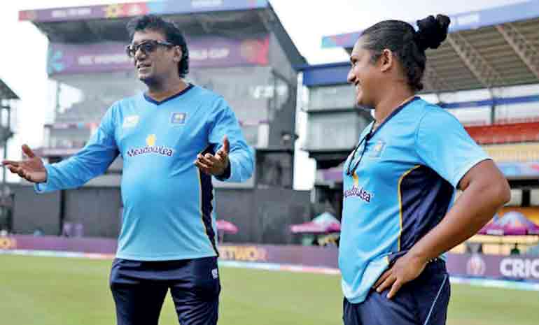 Head Coach Rumesh Ratnayake with Sri Lanka Women’s Captain Chamari Athapaththu during practice session at R. Premadasa Stadium