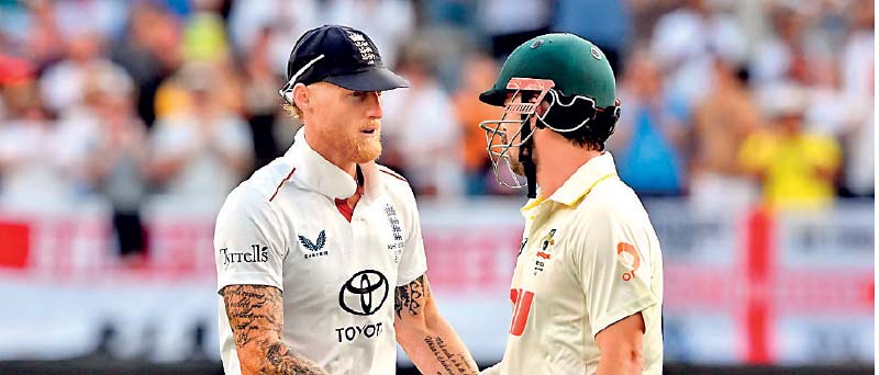 England Captain Ben Stokes (left) congratulates Travis Head after the end of the first Ashes Test on Saturday