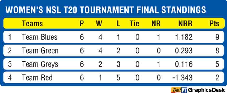Team Blues and Team Green led by national caps Harshitha Samarawickrama and Hasini Perera will meet in the final of the Women’s National Super League (NSL) T20 final at the P Sara Oval today in what could turn out to be a close contest.