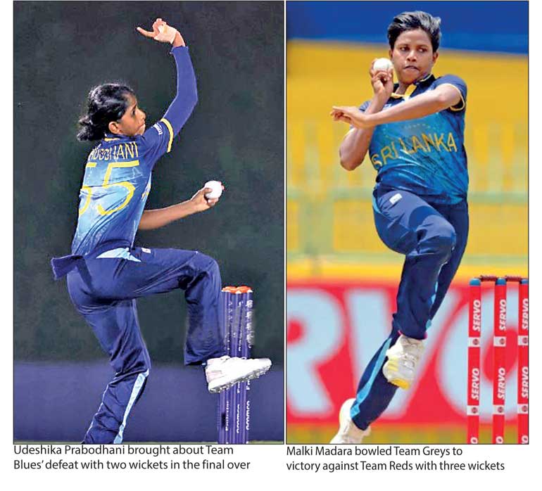 Team Blues had no one to blame for the defeat but themselves as they bungled in the final over when they had it all virtually sewn up. Harshitha Samarawickrama (27) and Kaushini Nuthyangana (41 off 33 balls, 6 fours) were the principal scorers for Team Blues.