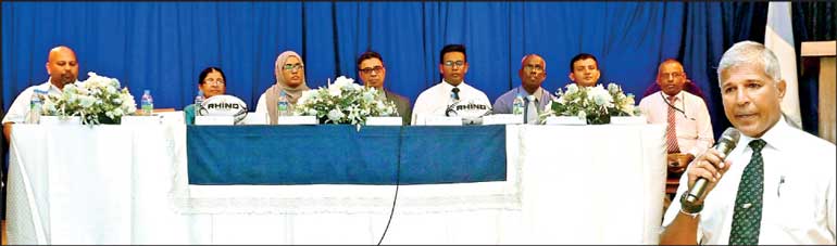 Tournament Director Dilroy Fernando addressing the press conference, others from left: Rugby Development Manager Masheesh, Game Prefect N. Harisharan, Norfolk Foods MD A. Zainudeen, Headmaster Rev. Nihal Fernando, Sports Coordinator Shaikh Mazeen, In-Charge Master T. Ramesh, In-Charge Master Chathuranga K., Member of OBU Romesh T.