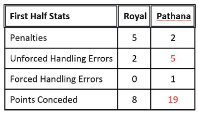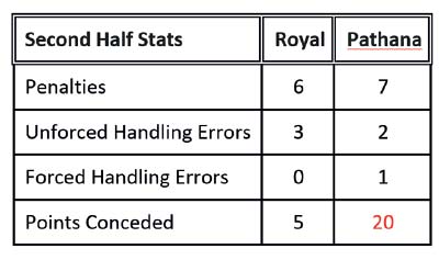 Although the stats are pretty much comparable in the latter half, we find a huge difference in the points conceded, that makes one wonder why? Royal continuously used short and long punts to get past Pathana’s primary defence, following them up with effective chases, that put the Greens’ last points of defences under tremendous pressure, with which the oppressors cake walked into multiple Tries. Other than on a solitary occasion when the Greens managed to collect the high ball, and worked it all the way from inside their 10m to score a Try, most of Royal’s punt kicks assisted their campaign. Moreover, the aforesaid Royal rampage commenced only after they opened scoring in the closing session, owing to a series of blunders by Pathana, that included 2 knock-ons (on Royal’s 25 and 50), and then a “Holding On” offence close to their 5m.
